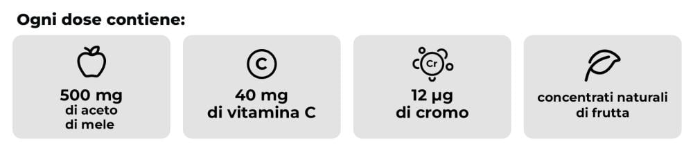 Aceto di sidro di mele in polvere, vitamina C (acido L-ascorbico), cromo picolinato, saccarosio, sciroppo di glucosio, acqua depurata, addensante (pectina), succo di mela concentrato, succo di melograno concentrato, succo di ribes nero concentrato, regolatore di acidità (citrato di sodio), succo di carota concentrato, aroma naturale, regolatore di acidità (acido citrico), agenti di rivestimento (olio di cocco, cera di carnauba), concentrato di carota nera.
