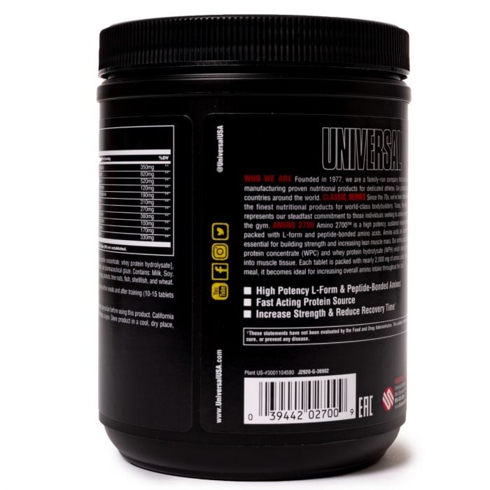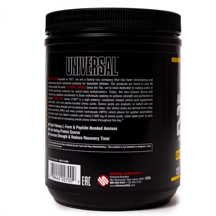 L'amminoacido a rilascio prolungato AMINO 2700 è caricato con la forma peptidica "L" degli amminoacidi legati. Sono derivati dal concentrato di siero di latte (WPC) e dall'idrolizzato di proteine del siero di latte (WPH), che favorisce un assorbimento più rapido nel tessuto muscolare. Ogni compressa contiene più di 2000 mg di aminoacidi e, se assunta prima di ogni pasto, diventa una fonte ideale per aumentare l'assunzione totale di aminoacidi nell'arco della giornata.