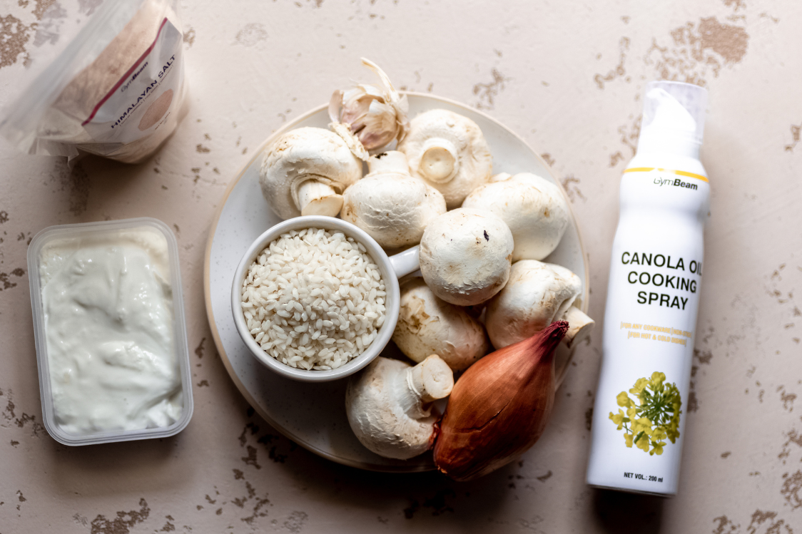 Iniziamo frullando il cottage cheese fino a ottenere una crema liscia e lo mettiamo da parte. Se però non ti danno fastidio piccoli grumi, puoi anche saltare questo passaggio. Cuoci il riso seguendo le istruzioni sulla confezione e lascialo raffreddare un po’ a parte. Nel frattempo, pulisci lo scalogno e l’aglio e tritali finemente. Taglia il petto di pollo a pezzetti, salalo e pepalo; pulisci i funghi e affettali. Spruzza un po’ d’olio nella padella e fai rosolare lo scalogno fino a doratura. Aggiungi l’aglio e i funghi e cuoci finché diventano morbidi, circa 5 minuti. Infine, unisci il pollo e continua a cuocere per circa 10 minuti, finché sarà tenero.