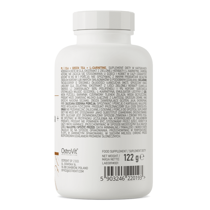 CLA + Tè verde + L-Carnitina è un trio di efficaci ingredienti brucia grassi in capsule. Il prodotto contiene acido linoleico coniugato, estratto di foglie di tè verde (Camellia sinensis L.) e L-carnitina. L'acido linoleico contenuto appartiene agli acidi grassi polinsaturi omega-6. A causa del contenuto di polifenoli e caffeina, l'estratto delle foglie di tè verde si colloca tra i popolari bruciagrassi.