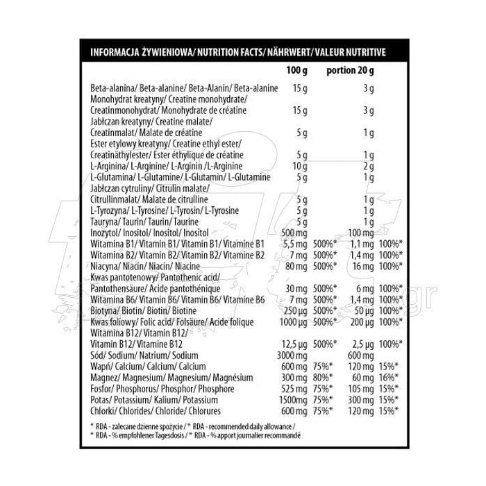 Beta-alanina, creatina monoidrato, regolatori di acidità: acido citrico, citrato di sodio e citrato di potassio, malato di L-citrullina, L-arginina, estere etilico della creatina, malato di creatina, L-glutammina, L-tirosina, taurina, fosfato di calcio, agenti antiagglomeranti: biossido di silicio, cloruro di potassio, carbonato di magnesio, emulsionante: difosfato disodico, aromi, inositolo, edulcoranti: aspartame e acesulfame K, vitamine (tiamina mononitrato, riboflavina, nicotinamide, calcio D-pantotenato, piridossina cloridrato, D-biotina, acido folico, cianocobalamina), coloranti: giallo chinolina (limone e arancia), giallo tramonto (pompelmo e arancia), rosso cocciniglia A (pompelmo) - può influire negativamente sull' attività e l'attenzione nei bambini.