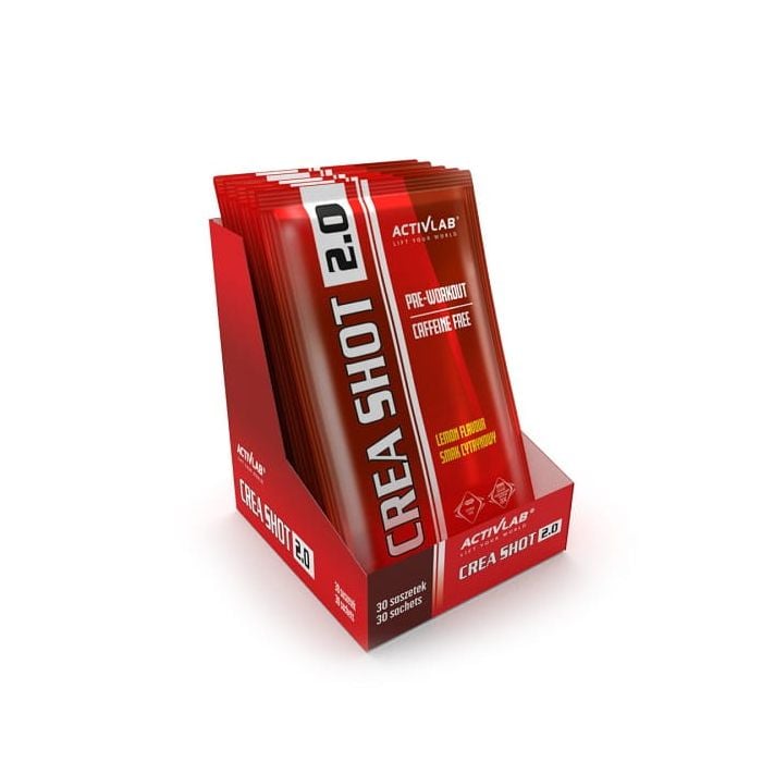 Crea Shot 2.0 è un integratore istantaneo pre-allenamento con diverse forme di creatina, beta-alanina, taurina, vitamine del gruppo B e molti altri principi attivi. Non contiene caffeina, è quindi adatto alle persone che mal tollerano questa sostanza. È ideale anche per le persone che si allenano di sera e hanno bisogno di un certo incoraggiamento dopo una lunga giornata, senza tuttavia influenzare negativamente il processo di addormetamento e la qualità del sonno. Una porzione contiene 5 g di creatina in varie forme. L'assunzione di 3 grammi al giorno aumenta le prestazioni durante i brevi ed intensi picchi di attività fisica, facilmente raggiungibili con questo prodotto. Contiene anche beta-alanina, una sostanza necessaria per produrre carnosina, la quale aiuta a scomporre l'acido lattico nei muscoli.