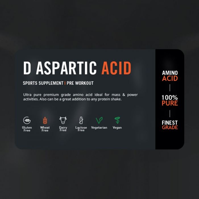 L'acido D-aspartico è una fonte di acido D-aspartico puro al 100% (DAA) in polvere. È un aminoacido non essenziale che spesso fa parte di vari integratori per supportare la produzione di testosterone e aumentare la forza. Il DAA è considerato un regolatore della sintesi del testosterone e questo ormone è importante per gli uomini perché, oltre al suo effetto sull'attività sessuale e sulla fertilità, è importante anche per la costruzione della massa muscolare. L'acido D-aspartico può essere utilizzato anche da vegetariani e vegani.