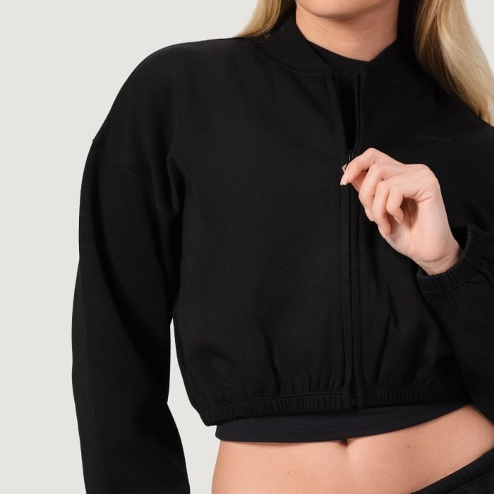 Questa felpa con il classico stile bomber in versione cropped, ha una vestibilità oversize con gli orli alle maniche e il bordo inferiore a costine. Ha un design pulito e minimal senza cappuccio.