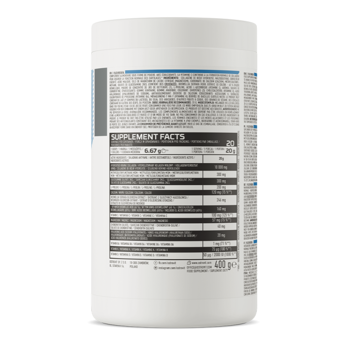 Il prodotto contiene un estratto di saw palmetto (Boswellia serrata), che è associato alla cura della salute delle articolazioni. Tuttavia, va menzionato anche l'acido ialuronico, che è associato all'idratazione delle cartilagini. Poi c'è il calcio, che sostiene il corretto funzionamento dei muscoli e, insieme al magnesio, contribuisce al mantenimento di ossa sane. Il prodotto contiene anche diverse vitamine e minerali, tra cui spicca la vitamina C. Contribuisce alla normale formazione del collagene e al corretto funzionamento delle ossa o delle cartilagini. Questo integratore sarà apprezzato dagli atleti, dagli amanti di uno stile di vita attivo e da chiunque voglia prendersi cura del proprio sistema muscolo-scheletrico. Puoi mescolarlo con acqua, succo di frutta o la tua limonata preferita.