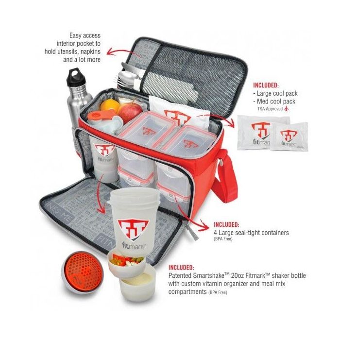 Borsa per alimenti La BOX LG di colore rosso, dove puoi confezionare tutto il tuo cibo sano e portarlo ovunque con te. È un organizzatore rivoluzionario per i tuoi corsi individuali. Ottimo design. Materiali di prima qualità. Funzionalità innovative. Borsa leggera e portatile realizzata in materiale di alta qualità - nylon balistico. Un cinturino resistente che è rimovibile. Nella confezione sono inclusi 4 contenitori ermetici (senza BPA), un pratico shaker brevettato per vitamine, integratori e proteine in uno (senza BPA) e 2 gel rinfrescanti (1 grande e 1 medio, entrambi testati dalla TSA) per conservare il cibo nel freddo.