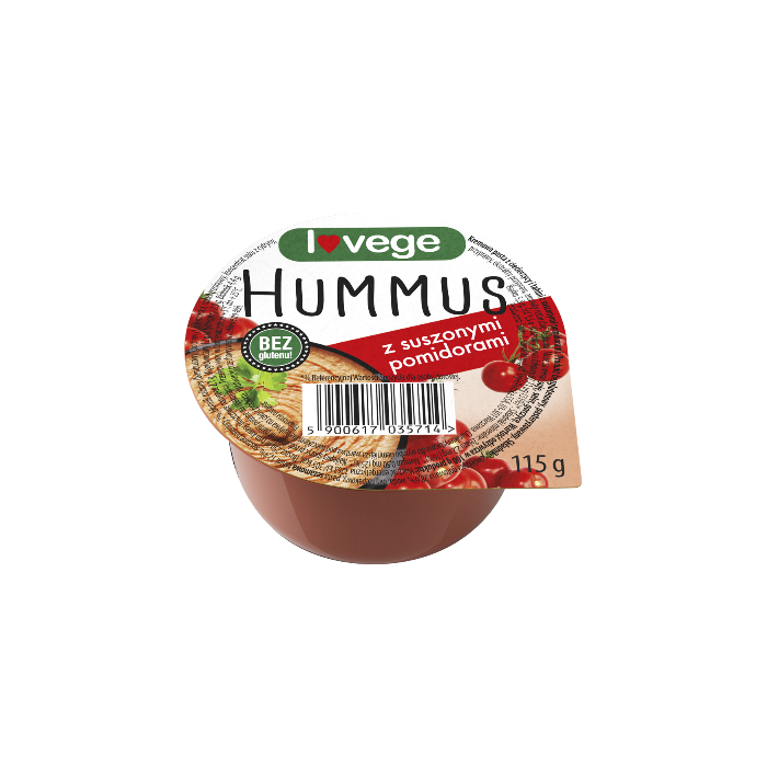 Hummus con pomodori secchi: ceci lessati 28%, acqua, olio di colza, pasta di sesamo tahina 12%, pomodori secchi 2%, fibra vegetale (bambù, piselli), sale marino, zucchero di canna, concentrato di succo di limone, spezie, estratti di pepe, naturale aromi, curcuma.