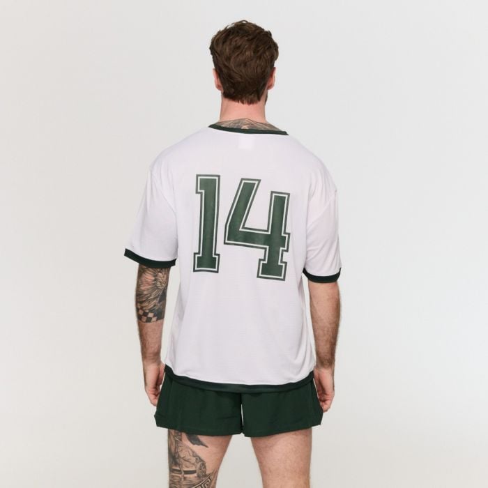 È caratterizzata da un taglio oversize con maniche corte e scollo rotondo, assicurando che non limiti in alcun modo i movimenti. Lo stile college basket è accentuato da bordature sulle maniche e sullo scollo, completato da una stampa sul petto e il numero sul retro. È un capo perfetto per completare al meglio ogni tuo outfir casual o sportivo.