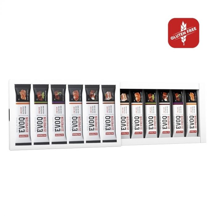 Protein Bar EVOQ è una gustosa barretta proteica a basso contenuto di carboidrati che contiene 21 g di proteine, fibre alimentari, zinco e colostro - tutto ciò di cui il corpo di una persona attiva ha bisogno. È senza glutine e puoi gustarlo in sei gusti interessanti come il caramello salato o il burro di arachidi.