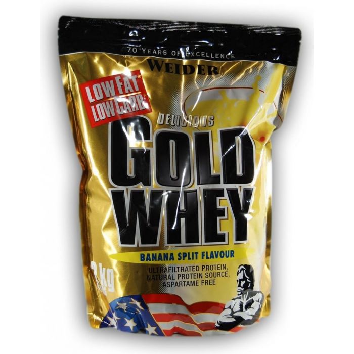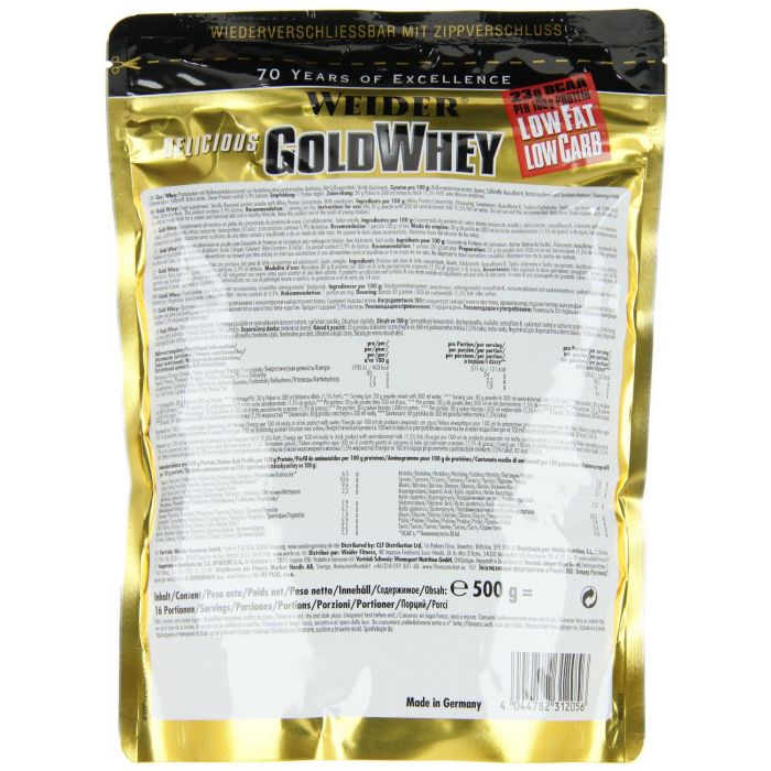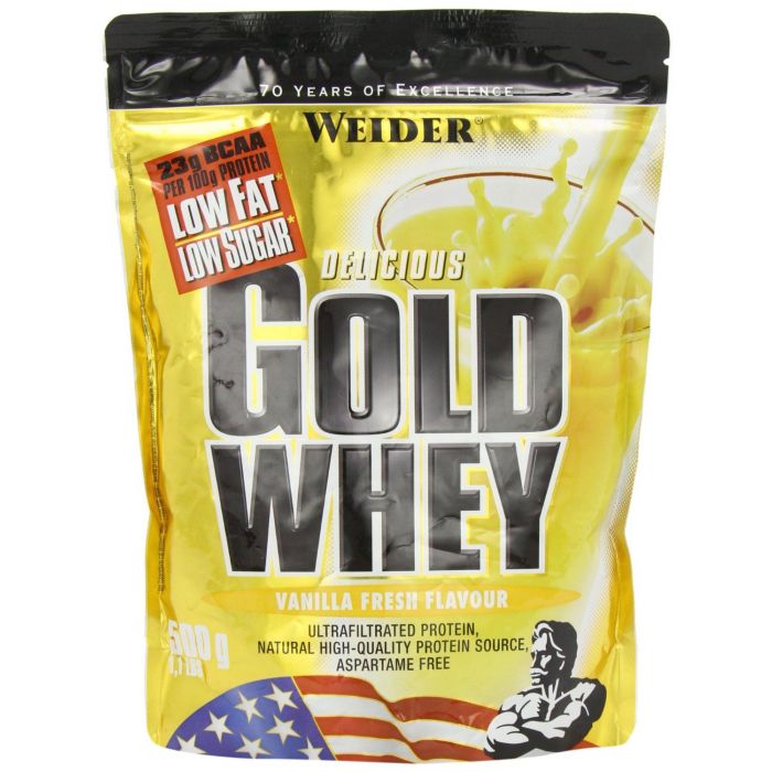 Gold Whey Protein dell'azienda Weider è un concentrato di proteine del siero di latte ultra filtrato che assicura un alto contenuto di BCAA 23 g in 100 g di proteine. Questa proteina all'80% con contenuto minimo di grassi e zuccheri, senza aspartame, contiene componenti bioattivi come la beta e l'alfa-lattoglobulina, che riducono l'acidità dell'organismo. Questi assicurano una rigenerazione e un adattamento più facili dell'organismo allo sforzo e, inoltre, le immunoglobuline rafforzano le difese dell'organismo ei glicomacropeptidi limitano l'appetito.