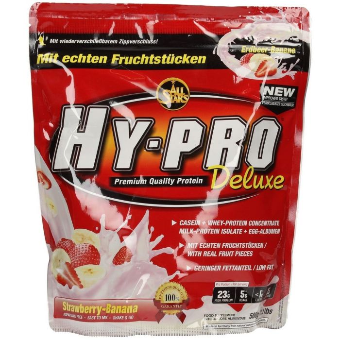 Hy-Pro 85 Deluxe è una proteina multicomponente premium da 4 fonti proteiche: caseina, isolato del latte, proteine del siero di latte e albumina d'uovo con diversi tempi di assorbimento che garantiscono una ricezione a lungo termine degli aminoacidi . Contiene l' 80% di proteine , ha un contenuto minimo di grassi e carboidrati. È arricchito da pezzi di frutta e vitamine.