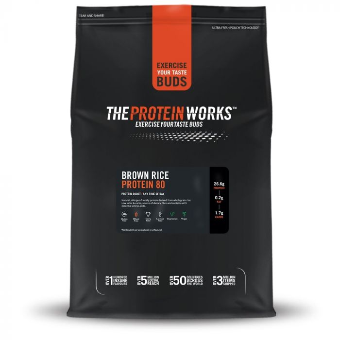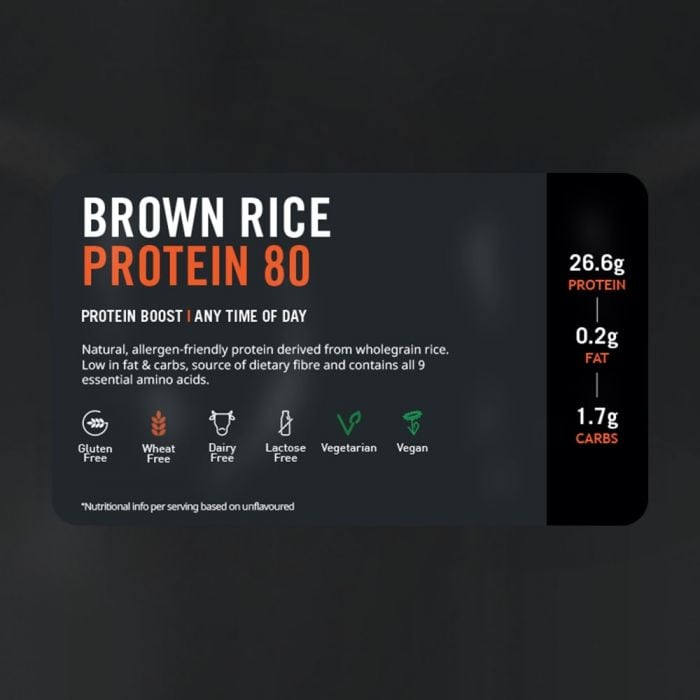 Proteina 80 di riso integrale è una proteina vegana di origine vegetale di alta qualità classificata come proteina di riso. I chicchi interi di riso integrale sono l'ingrediente grezzo usato per la produzione di questo prodotto. Grazie alla sua composizione pura, è di per sè senza glutine e lattosio e non contiene organismi geneticamente modificati (OGM). È ottimo grazie al suo alto contenuto di proteine di origine vegetale, le quali contribuiscono alla crescita e al mantenimento della massa muscolare, e per l'assenza di sostanze di zavorra aggiunte. La composizione pura di questa proteina del riso potrebbe essere particolarmente adatta alle persone con intolleranze alimentari, come quella al glutine o ai latticini. Questo prodotto è inoltre adatto per le persone vegetariane e vegane e per chiunque altro che abbia voglia di ravvivare la propria alimentazione con delle proteine a base vegetale. È ottimo se preso prima dell'allenamento come bevanda proteica o nei frullati, che spesso sono carenti di proteine.