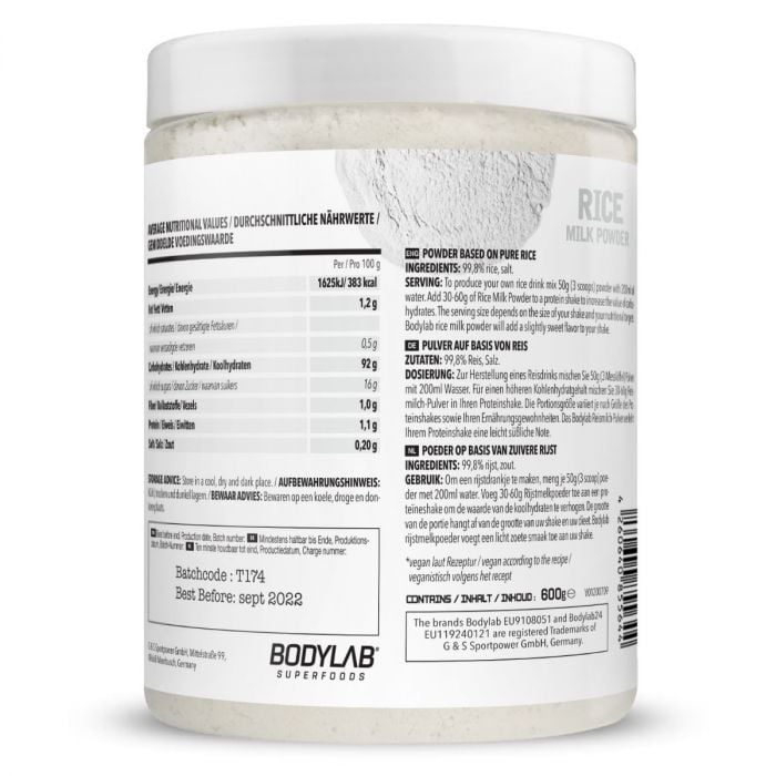 Il Latte di Riso in Polvere è una fonte di carboidrati facilmente solubile , ottimo per arricchire i frullati proteici o come alternativa al latte . Contiene il 99,8% di riso , solo 0,2 g di sale e un minimo di grassi. Non contiene zuccheri aggiunti , lattosio, conservanti artificiali, coloranti o dolcificanti. È adatto anche ai vegani.
