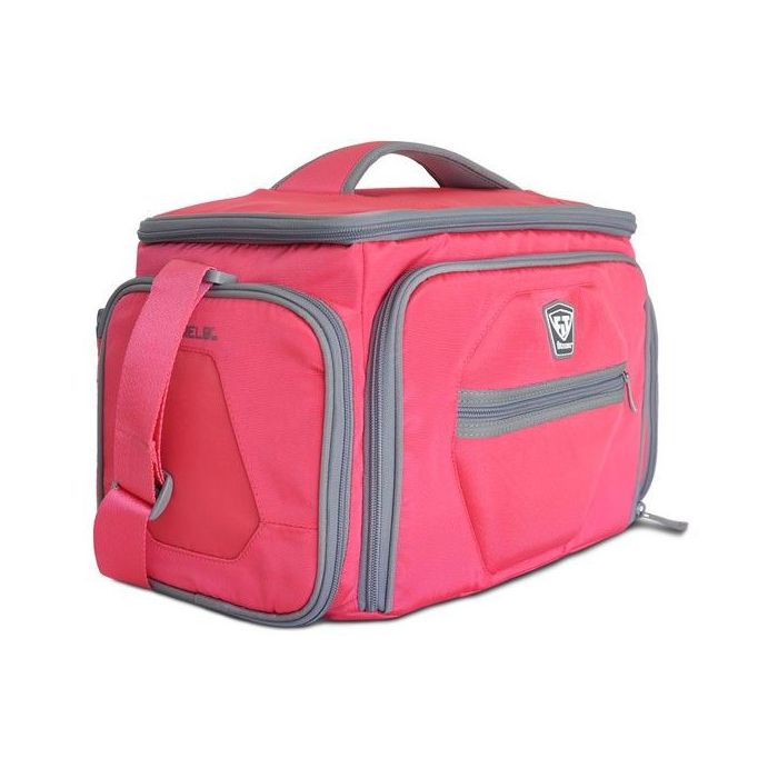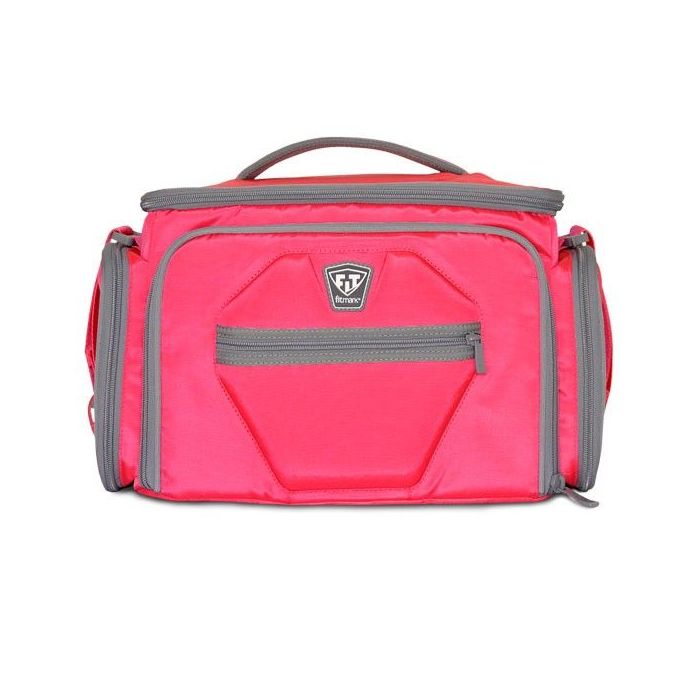 Borsa per lo sport e la preparazione dei pasti The Shield LG in colore rosa con un bel design, caratteristiche innovative e materiale di altissima qualità. È leggero, portatile, realizzato in robusto nylon poliestere. Contiene 5 grandi contenitori per i pasti principali, 2 confezioni refrigeranti , un dispenser per vitamine, integratori e bevande proteiche, 2 tasche innovative per la tua bottiglia d'acqua, barrette proteiche e frutta. Mantiene il cibo fresco fino a 8 ore.
