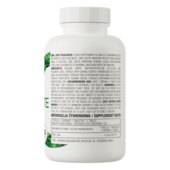 Zinco Picolinato sono piccole pasticche che contengono lo zinco sotto forma di picolinato, eccezionale nell'assorbimento. Lo zinco è importante per gli umani per il corretto funzionamento di vari processi. Nel corpo, contribuisce alla fertilità e alla funzione riproduttiva, mantenendo regolari i livelli di testosterone, ma giocando un ruolo anche nel processo della divisione cellulare e della corretta sintesi del DNA. Lo zinco aiuta anche per il corretto funzionamento del sistema immunitario e per la protezione contro lo stress ossidativo. Aiuta il metabolismo dei macronutrienti, degli acidi e delle basi, degli acidi grassi e della vitamina A. Tra le altre cose, è utile per la sua funzione cognitiva, per la sintesi proteica e per mantenere sane le ossa, i capelli, le unghie, la pelle e una buona vista. La forma di piccole pasticche è benefica per le persone che hanno difficoltà nell'ingoiare le pasticche. Riceverai 15 mg di zinco in ogni dose.