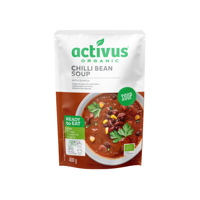 Zuppa Biologica Chili Vegano con Fagioli è fatta con ingredienti bio e contiene solo ingredienti freschi senza l'uso di conservanti. Ha un aroma e un gusto originale, che puoi goderti ovunque, perchè la zuppa è pronta per essere consumata subito.